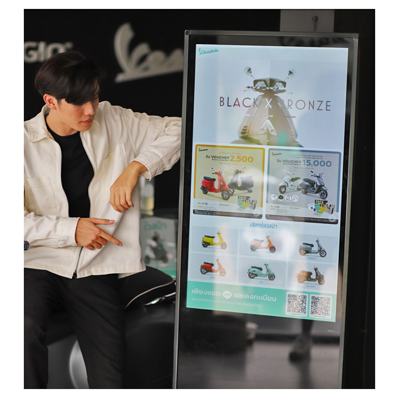 ถ้าพูดถึงเวสป้า หลายๆคนคงคิดว่าเป็นรถคลาสิคที่เน้นความไม่ทันสมัยใช่ม้า แต่บอกเลยครับปัจจุบันเวสป้าถึงแม้รูปทรงจะยังคลาสิคแต่ภายในตอนนี้เทคโนโลยีล้ำกว่าปัจจุบันนะ และโชว์รูมก็เช่นกันครับ อันนี้ที่ถ่ายมาเค้าเรียก Digital Sign Board ครับไอ้หน้าจอนี้อะมันเป็นแบบ Touch Screen คือระบบสัมผัสที่เชื่อมต่ออินเตอร์เน็ตอะ เราสามารถดูแคตตาลอค ข้อมูลรถ และอื่นๆผ่านทางนี้ได้เลยนะ ทันสมัยม๊วก