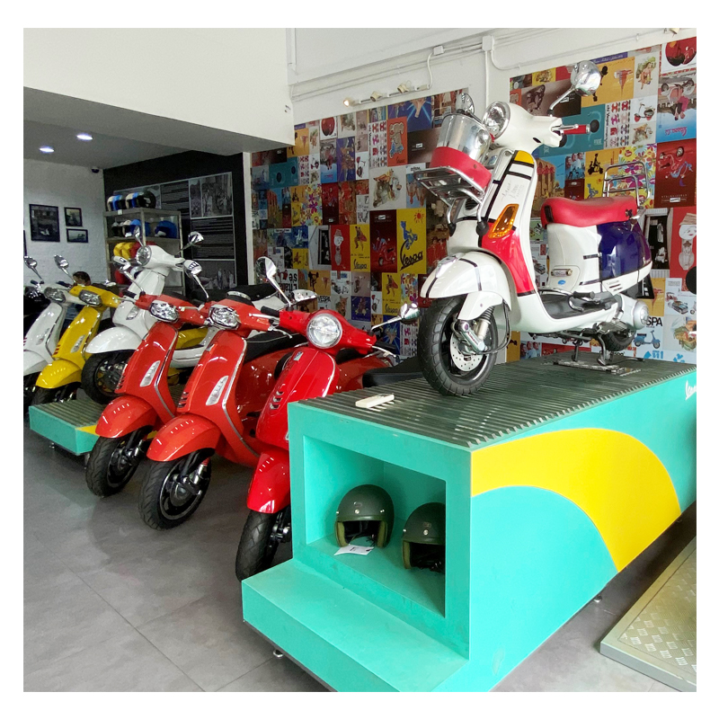 ภายในนี้นอกจากรถเวสป้าตัวเป็นๆแล้วนะครับ ยังมีพวกของที่ระลึก หมวกกันน็อค อะไหล่ตกแต่ง วางไว้ให้รับชม และที่สำคัญลูกค้าที่นี่หน้าตาดีนะครับ จากที่นั่งสังเกตมาชาวเวสป้าแบบดูดีมีชาติตระกูลเลย อยากชมรถรุ่นไหนทั้งรถใหม่และมือสองมีหมดครับ โชว์รูมติดแอร์เย็นสบาย ชา กาแฟครบ ใครสนใจก็แวะไปเยี่ยมชมได้ครับ ที่สำคัญที่นี่ทางเวสป้าตั้งมาตรฐานป้องกันโควิทไว้ดีมาก พี่ๆในโชว์รูมตรวจ ATK กันทุก 2 ถึง 3 วันครับ และมีเจลแอลกอฮอล์ที่ทางเวสป้าสั่งผลิตพิเศษมาให้ แอบเม้านิดนะครับ คือกลิ่นมันจะหอมๆแบบตะไคร้บนเลม่อนอะ แบบดี้ดี